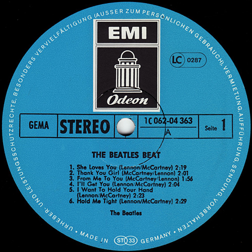 type-4: "EMI / Odeon" logo mark and "LC" mark in black ink were printed at the top of the blue label. "MADE IN GERMANY" and ST 33 in a oval for stereo edition were printed. EMI / Odeon Blue label variations: Type-1: GEMA logo in a box / ST 33 in a circle Type-2: GEMA without box / ST 33 in a circle Type-3-1:GEMA without box / ST 33 in a oval Type-3-2:GEMA without box and (P) 196X / ST 33 in a oval Type-4: 062 with "LC" mark / ST 33 in a oval Type-5: 072 with "LC" mark / ST 33 in a oval The change to the blue label came during the second half of 1968, some months before the change to the EEC catalog numbers. Several LP's are known with blue labels and the old "SMO" number." The change from the old logo to the new logo happened around catalog number 74 411. The EEC numbering began just after 74 490. For Domestic issue