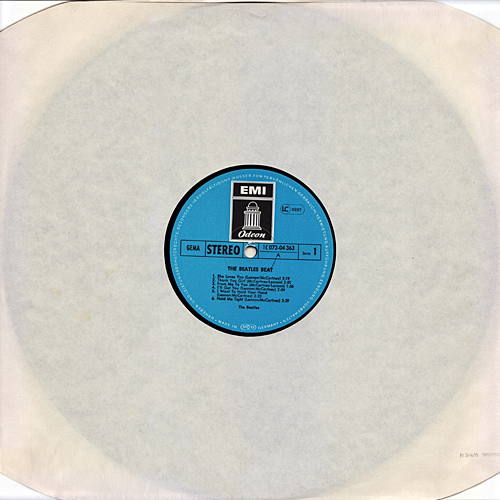 Germany, made in France. It had the German 1C 072 catalog number, and the GEMA reference on the labels, but it was pressed by Pathe Marconi on sky blue Odeon labels. It was not unusual that export pressings had the country code and/or release number of the country that they were exported to. For example, France (country code 2C) pressed 1A Apple records for the Netherlands, Italy (3C) pressed 2C copies for France and even pressed record with blue "French-style" Odeon labels that had "Made in Italy", Holland (5C/1A) pressed for Germany (1C), Sweden (7C) pressed for Holland (1A/5C) etc. etc. etc. With sleeves it is even more complicated sometimes. "LC 0287 (Odeon label code)" was printed at the right side of the center hole. *The EEC numbering mean the country of release can been readily identified from the first two characters : 1C = Germany 2C = France 3C = Italy 4C = Belguim 5C = Holland 7C = Sweden 10C = Spain 11C = Portugal 14C = Greece Special note for Spain - "1J" instead of "10C" was used for several years (1969 to 1977, as from the "Get Back" single) to refer to records manufactured by EMI-Odeon in Spain, before the international "European codification". All references with "1J" were replaced by "10C" as from 1977. * GEMA (Gesellschaft für musikalische Aufführungs- und mechanische Vervielfältigungsrechte.) was started in 1915 and handles the copyright in Germany. |