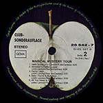 club edition. Dark Green Apple label. Side-2, so called "Gley sliced apple". Apple label has a "Club Sonderauflage" credit. The jacket is a single type, with only a coating on the front. Half laminated cover type / Side-2 matrix=B-3 There are other sources for the 3 true stereo (*) and with the 1971 stereo mix of Strawberry Fields Forever(**). (*) 3 True stereo "Penny Lane", "Baby You're A Rich Man" and "All You Need Is Love" (**) Strawberry Fields Forever basic recording- 29 Nov 1966 and 8 Dec 1966 additional recording- 29 Nov 1966 and 8,9,15,21 Dec 1966 master tape- 4 track 2d and 3d generation The lyrics of the following songs are printed on the back.