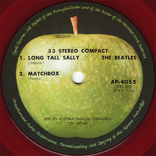 label. In 1969, Toshiba had to reissue on the Apple label all the records previously issued on the Odeon label. And in the Apple label, there are two subtypes, TOSHIBA MUSICAL INDUSTRIES and TOSHIBA EMI. Further more, the early copies of the APPLE-TOSHIBA MUSICAL INDUSTRIES type have dark Apple on its label, though the late copies have light one. Toshiba EMI made duophonic mixes for the nine songs that had no stereo masters at the time the EPs were compiled. "I Want To Hold Your Hand", "She Loves You", "Long Tall Sally", Match Box", "Slow Down", "Sie Liebt Dich", "Paperback Writer", "Strawberry Fields Forever" and "Penny Lane" are effective simulated stereo mixes. This E.P. was manufactured two ways: both Black and Red vinyl. |