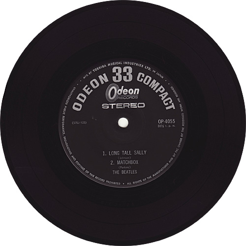Japanese 4th. E.P. Odeon label has "Odeon 33 Compact" across the top and "STEREO" across the middle of the label, and all Odeon Compact 33's were issued in stereo (or simulated stereo). Toshiba EMI made duophonic mixes for the nine songs that had no stereo masters at the time the EPs were compiled. "I Want To Hold Your Hand", "She Loves You", "Long Tall Sally", Match Box", "Slow Down", "Sie Liebt Dich", "Paperback Writer", "Strawberry Fields Forever" and "Penny Lane" are effective simulated stereo mixes. This E.P. was manufactured two ways: both Black and Red vinyl. |
