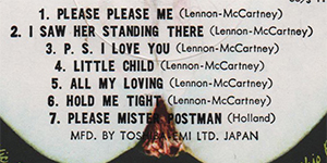 catalog. Issue n° 26 in the series, with Japanese flag obi. Light green apple label. The words "MFD. BY TOSHIBA-EMI LTD. JAPAN" was printed at the bottom of the label. This is the first album released in Japan. The Japanese version looks similar to the U.S. version but has a different track listing, a red and orange (rather than brown and blue) front cover title, and a different back cover. The obi: Country flag obi. This style Obi came into use in June 1976 to promote the EAS series of Beatles reissues. It is a wide Obi that has the flag of the country of the LP's origin at the top. The LP's series number is located on the Apple logo and at an angle at the bottom. Has a red background. Country Flag Obi series, which was reissued in 1976, has been released in three parts. >1st time: 5 June, 1976 >2nd. time: 20 June, 1976 >3rd. time: 5 July, 1976. Each time, the back of the Obi changes little by little.