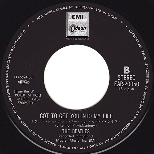 the double album "Rock 'n' Roll Music". EMI/ Odeon labe(Update: 19th. December 2018)l. The phrase "(from the LP 'ROCK 'N' ROLL MUSIC' EAS-77009/10)" was printed at the left side of the center hole. Picture sleeve issue with lyric & discography insert. Whilst other territories that released this single (e.g. the USA for one) had Got To Get You Into My Life as the A Side and Helter Skelter as the B Side, the Japanese release reversed the tracks. In addition the other releases used a sleeve mirroring that of the compilation album, but this was not the case here. Toshiba had already begun use of the new EMI/Odeon label as early as 1976 on certain new releases not covered under the Apple label. By the early 1980's, the EMI/Odeon label had completely supplanted the Apple label on all Beatles releases. When the record label change, the EMI/Odeon logo also replaced the Apple logo on the front sleeves of all records. |