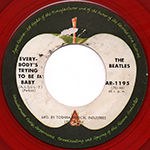 label (maybe). The 3rd. Pressings have the letter "A (Side-A)" and "B (Side-B)" on the each side of the label. In 1969, Toshiba had to reissue on the Apple label all the records previously issued on the Odeon label. And in the Apple label, there are two subtypes, TOSHIBA MUSICAL INDUSTRIES and TOSHIBA EMI. Further more, the early copies of the APPLE-TOSHIBA MUSICAL INDUSTRIES type have dark Apple on its label, though the late copies have light one. The words "Toshiba Musical Industries Ltd." and "¥400 ( in red / Roman type)" were printed at the bottom of the lyric sheet. On front cover, there are four variations, Type-1: "¥400" printed in red / Sans-serif type Type-2: "H ¥400" printed in black / Sans-serif type Type-3: "¥400" printed in red / Roman type Type-4: "H ¥400" printed in black / Roman type Apple late pressings (light green apple label) have the letter "A (Side-A)" and "B (Side-B)" on the each side of the label. This single was manufactured two ways: both Black and Red vinyl. |