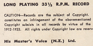 Copyright law are reserved." credit on the back bottom. Company name "His Master's Voice (N.Z.) Ltd." was printed at the bottom. |