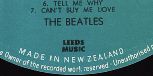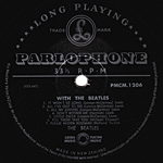 reissued onto this new style in both mono and stereo. Outer rim text starts with "His Masters Voice (N.Z.) Ltd." His Master's Voice was a subsidiary of EMI Music and was set up in the 1930s under the HMV name in New Zealand. It was, until the 1970s, the biggest manufacturer and distributor of records in New Zealand. In addition to its own labels, HMV, Parlophone, Regal Zonophone, Capitol, and Columbia, it manufactured many others including Decca, Warner Brothers and, at times, Atlantic. In 1973 the HMV label was rebranded worldwide as EMI. New Zealand Parlophone did not issue Beatles LP's in stereo until early 1964. The existence of the first two LP's in stereo on this label is disputed. |