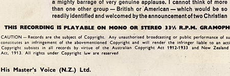 Copyright law are reserved." credit on the back bottom. Company name "His Master's Voice (N.Z.) Ltd." was printed at the bottom. "Lithoed in New Zealand" by CSW (Printing house) at the bottom of the inside cover. |