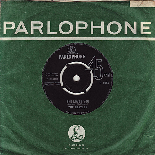 and straight (late issue was wavy cut) top. When Parlophone started with silver / black labels they also redesigned their company sleeves. With Parlophone logo in a circle on front. EMI introduced their record tokens on this sleeve and the price was 6/- to 50/-.