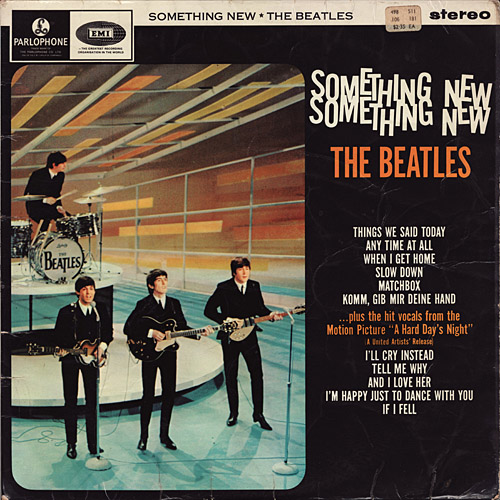 | THE PARLOPHONE CO. LTD. (capital letter)" was printed at the perimeter. The "(P)-1964" statement was printed at the left part of the label. The first copies of gSomething Newh has label error gSold In UK ch. In the center of the LP have letters embossed (K and T). The letters are tax code. | |||||