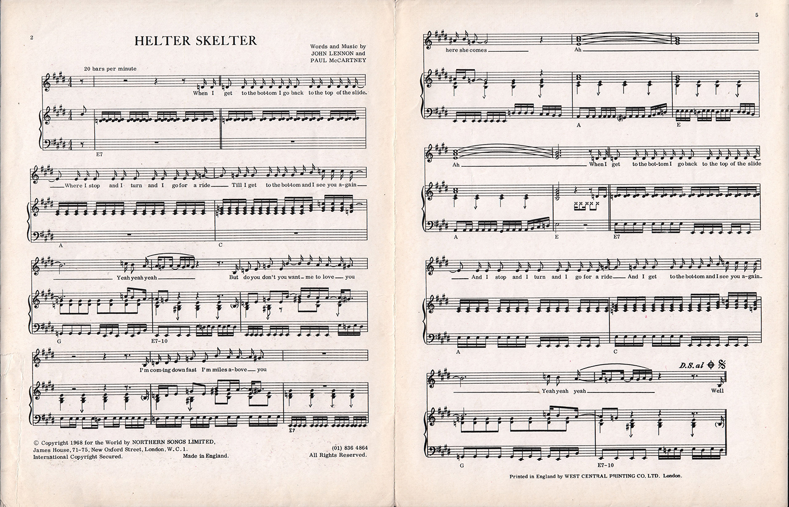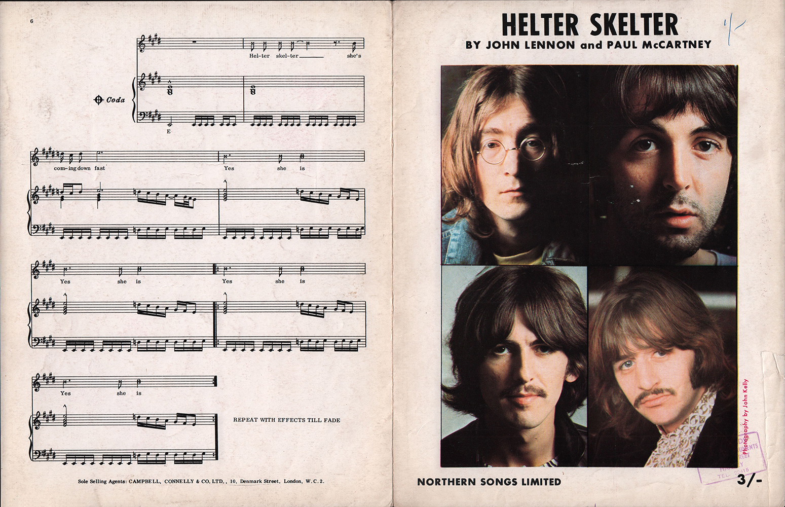 Publisher's credit "NORTHERN SONGS LIMITED" was printed at the front of the sheet. Price: 3/-=three shillings. |