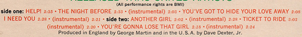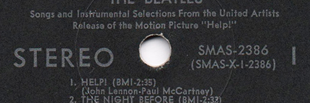These label variations are the only ones with the title and information for the opening song Help! printed above the spindle hole. | |||