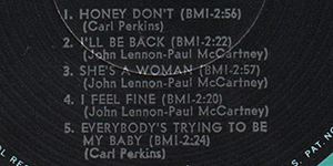 The original issue Capitol albums were manufactured with black label backdrops with an outer rim colorband. Label copy information specific to each album appears in silver print. The labels for records manufactured on: 1) The East Coast were printed by Keystone Printed Specialties, Inc. in Scranton, Pensylvania. 2) The West Coast were printed by Bert-Co Enterprises in Los Angeles, California. The East Coast and West Coast mono label variations: 1) First pressings of the East Coast label has "BEATLES' 65" loosely spaced. 2) First "West Coast" Pressings have "BEATLES' 65" tightly spaced. In order to meet the huge demand for Beatles records, Capitol subcontracted with other companies to press its albums. The three companies most frequently used by Capitol were the former Big Three — Columbia, Decca and RCA. Columbia manufactured albums for Capitol at its factories in Pitman, New Jersey, Terre Haute, Indiana, and Santa Maria, California. Columbia LPs have a 2 11/16"-diameter ring located 1 3/16" from the center hole. The trail off areas have hand etched matrix and lacquer numbers. Columbia discs pressed in California have Bert-Co labels while those manufactured in Pitman and Terre Haute have Keystone labels. Pitman pressings have a machine stamped “P” in their trail off areas. Columbia LPs with “54” hand etched in their trail off areas were probably pressed in Terre Haute. Decca pressings have a single ring with a diameter of just under 1" located 5/16" from the spindle hole. The trail off areas have hand etched matrix and lacquer numbers followed by a plant identification letter (“P” for Pinckneyville, Illinois, or “G” for Gloversville, New York). Some earlier Decca pressings have a 2 3/4" diameter ring in addition to the 1" diameter ring. RCA pressings have an indented 2¾"-diameter groove that is 1¼" from the spindle hole. The West Coast RCA discs were pressed in Hollywood with Bert-Co labels. They normally have hand etched matrix and lacquer numbers and a hand etched “W” in their trail off areas. RCA albums manufactured in Rockaway, New Jersey, and Indianapolis, Indiana, have Keystone labels. The Rockaway disc trail off areas have machine stamped matrix and lacquer numbers followed by "R1" and a hand etched "RR." |