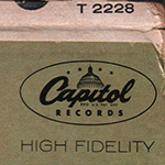 The text of the perimeter print in blue on the original issue discs states "MFD. BY CAPITOL RECORDS. INC. U.S.A. T.M." to the left of a small Capitol logo, with "• MARCA REG. • U.S. PAT. NO. 2, 631,859" to the right. On some labels, the perimeter print is in white. | ||||||||||||||||||||||||||||||||||
