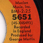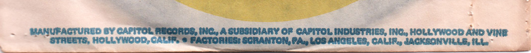 similar as the print appearing on the regular issue 45s. "MFD. BY CAPITOL RECORDS. INC., A SUBSIDIALY OF CAPITOL INDUSTRIES, INC., U.S.A. ® [Capitol logo] MARCA REG. U.S. PAT. NO. 2,631,859" was printed in black at perimeter. |