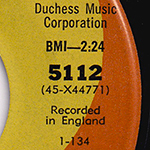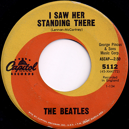 It remained on the Billboard chart for 15 weeks. Capitol originally scheduled the single for release on 3rd. January 1964, but moved up its release date to 26th. December 1963, after some U.S. radio stations began playing the U.K. single containing the song. The picture sleeve issued with Capitol's first Beatles single features a classic black and white Dezo Hoffmann portrait of the group dressed in their collarless jackets. Ringo is seated in a wooden chair, surrounded by his fellow band mates. Paul holds a lit sigarette between the top and second fingers of his light hand. "THE BEATLES" , the song titles, the catalogue number 5112 and the Capitol oval logo appear in the white background rectangle above the photo. The open side of the sleeve has "I WANT TO HOLD YOUR HAND" above and in larger type than "I SAW HER STANDING THERE". The other side of the sleeve reverses the song titles. The picture sleeves were prepared by two different printers: Queens Litho in New York (East Coast) and Bert-Co Enterprises of Los Angeles (West Coast). 1) The East Coast Queens Litho sleeves shows all of George's head, and have a straight cut top. 2) The West Coast picture sleeve variation crops off part of George's head, and have a "tub" cut top. Original pressings are on yellow and orange swirl Capitol labels without "subsidiary" print in the label rim text. There are only two typesetting variations. 1) The East Coast variation has larger catalogue numbers than West Coast counterpart. The East Coast labels were printed by Keystone Printed Specialities Co., Inc. of Scranton, Pennsylvania. 2) West Coast labels were printed by Bert-Co Enterprises of Los Angeles. The first pressings of the record are identified by the "Walter Hofer" publishing credit on the "I Saw Her Standing There" side of the disc. On the second pressing, the publishing credit on the "I Saw Her..." side was changed to "George Pincus & Sons Music Corp." There also exist a third label variation where the publishing credit on the 'I Saw Her..' side was changed to "Gil Music Corp." The original 1964 sleeves do not have periods in "REG US PAT OFF" (under the Capitol logo). The reissue sleeves from 1994 have periods in "REG. U.S. PAT. OFF." In addition, on the original sleeve, Paul is holding a cigarette, while on the 20th anniversary sleeve, the cigarette has been removed. |