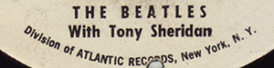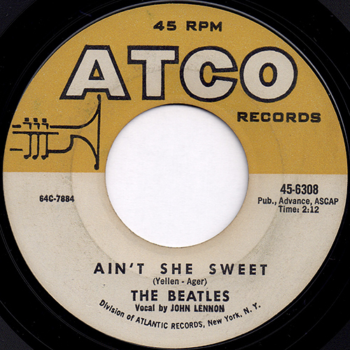the record was released in early June, 1964. On month after issuing its first Beatles' single, Atlantic released a second pairing of the Bert Kaempfert-produced songs on 6th July 1964. "Ain't She Sweet", with John Lennon on Lead vocal, was coupled with Tony Sheridan's performance of "Nobody's Child". Atlantic used three different factories to press its first Atco Beatles single: (1) MGM Records in Bloomfield, New Jersey labels printed by Queens Litho and can be identified by the stylized machine stamped "S" in their trail off areas. (2)Monarch Records in Los Angeles, California pressings are styrene and have the machine stamped (MR) logo and hand etched job numbers in their trail off areas. (3) Plastic Products in Memphis, Tennessee do not have a factory identification logo. Many of the Ain't She Sweet singles were packaged with a picture sleeve. The sleeves have a straight cut top and were manufactured by Queens Litho. ATCO 6308 1st. Press: The initial pressings of the record do not list the song-writers for Nobody's Child, but credit the arrangement to Tony Sheridan by printing "Arr. by Sheridan" below the song title. The publisher's name is listed as "Hill & Range, BMI". Type-1) The Bloomfield stock copies: has "THE BEATLES" in small loosely spaced letters and "With Tony Sheridan" below the group's name on Side-2. The side-1 has "VOCAL BY JOHN LENNON" in small uppercase letters to the left of the center hole. Type-2-1) Some of the discs are styrene Monarch Pressings: have "THE BEATLES" in mid-sized tightly spaced letters and "with TONY SHERIDAN" below the group's name on the side-2. The side-1 has "Vocal by JOHN LENNON" below the group's name. Their trail off areas have the job number ?-53303 on side-1 and ?-53304 on the side-2. The (MR) logo is mistakenly stamped in reverse. Type-2-2) There are also vinyl West Coast discs that were pressed by another factory. These records do not have job numbers in their trail off areas. Type-3) The Plastic Products pressings: have the same basic layout as the Bloomfield disc except that the group's name and the John Lennon vocal credit are in larger letters. ATCO 6308 2nd. Press: The second pressings of the single have the same side-1 labels, but the side-2 correctly credits the song to "Foree-Coben" and lists the publisher as "Milene, ASCAP" Type-1) The Bloomfield Pressings (=this record) Type-2) Monarch Pressings Type-3) The Plastic Products Pressings ATCO 6308 3rd. Press: The third pressings. In 1969, Atco reissued the single. These later pressings have different perimeter print. The reissue labels have "Mfg. by Atlantic Recording Corp., 1841 Broadway, New York, N. Y." in black uppercase letters. |