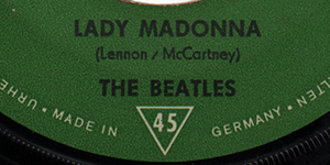 mark in white was printed above the center hole. "MADE IN GERMANY (circuler)" and 45 in a triangle were printed at the bottom of the label. In fall (maybe August), 1966, the rim print was changed on all Odeon releases to read: URHEBER- UND LEISTUNGSSCHUTZRECHTE, BESONDERS VERVIELFÄLTIGUNG (AUSSER ZUM PERSÖNLICHEN GEBRAUCH), VERMIETUNG, AUFFÜHRUNG, SENDUNG, VORBEHALTEN Roughly speaking, this translates to: "Copyright and property rights, especially reproduction (except for personal use), rental, performance, and broadcasting, [are] reserved." Again for the benefit of those who do not read German, We will call this the "Urheber" issue. Singles made from 1967 to 1969 are of the "Urheber" label style. 1st. Press: SLEEVE: Tiroler sleeve LABEL: Green Odeon label, white logo and black print. Matrix on the left side 2nd. Press: SLEEVE: Green sleeve and straight M of Madonna L LABEL: Green Odeon label, white logo and black print. Matrix on the left side 3rd. Press: SLEEVE: Green sleeve and steep M of Madonna LABEL: Green Odeon label, white logo and black print. Matrix on the right side "GEMA**/BIEM***" :a marking that indicates what company is responsible for the copyright payments for the material released on the record to the proper publishers. It is important to remember that a record with the above-mentioned marking isn't necessarily made in Germany but which was intended for sale in Germany. |