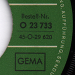 number "O 23 733" was printed at the right side of the label. Matrix and running time on the left side. "GEMA" logo was printed on the both sides of the label. |