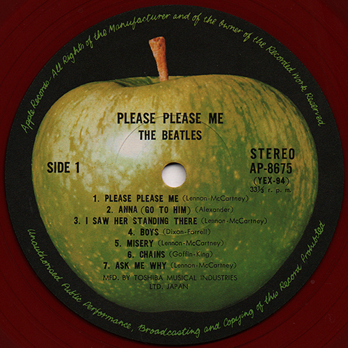 Japan. The commemorative disks of the Beatles' Japan visit: Toshiba EMI needed to make special commemorative disks, but the idea of making an original best album ("the Best of the Beatles" OP-7177), which they once planned to release in 1965, was turned down by E. M. I. in England again and this album remained unreleased. therefore, they had to use existing albums to promote for the 'Yeah Yeah Sale'. At the early stage of the sale, they advertised the then new album "Rubber Soul" (released on 15th March 1966 in Japan), but later they decided to release two albums "Please Please Me" and "With The Beatles", both of which had been unreleased in Japan. They re-named them as "STEREO! This is the Beatles Vol.1" and "Vol.2", changing song orders to put the most popular songs in Japan at the first place of every record. They made original covers, gatefold covers with photo books inside, and they emphasized that these were STEREO records (this might be an impact because stereo equipment had just become popular). The jacket was replaced with a completely different photo. Dark green Apple label Type-1with black print. The words "MFD. BY TOSHIBA MUSICAL INDUSTRIES LTD. JAPAN" was printed at the bottom of the label. In Novemver 1968, that was the date when Apple Corp Ltd. of England and Toshiba came to an agreement on the manufacturing and distribution of the Beatles' records in Japan. As part of that agreement, Toshiba had to reissue on the Apple label all the records previously issued on the Odeon label. The sleeves also had to be altered to desplay the Apple logo. Futher still, all the Odeon catalog number prefixes were changed to ones with Apple prefixes. In most cases, only the prefixes were changed and the catalog numbers were left intanct. Odeon singles, EPs, and LPs with the OR or OP prefixes were changed to Apple singles, EPs, and LPs with the AR or AP prefixes, respectively. But Toshiba did not instantly implement all these changes and did not immediately withdraw all Odeon label records. In fact, the phasing out of the Odeon label products and the phasing in of the Apple label was a lengthy process taking several months at least. The very first record in Japan issued under the Toshiba/Apple contract and bearing the Apple label was "The Beatles double LP (the White Album)", released on 21th. January 1969. And unlike elsewhere in the world, the first single in Japan to bear the Apple label was not "Hey Jude / Revolution" but rather "Ob- La-Di, Ob-La-Da / While My Guitar Gently Weeps", released on 10th. March, 1969. And in the Apple label, there are two subtypes, TOSHIBA MUSIC and TOSHIBA EMI. Further more, the early copies of the APPLE-TOSHIBA MUSIC type have dark apple on its label, though the late copies have light one. Gatefold type. Full laminated soft cover with attached 8-page color booklet. Red vinyl: Besides good sound and quality printing, Japanese records also offered some other things of interest to the collector. One of the primary manufacturing companies in Japan, Toshiba, pressed a lot of their records on red, “Everclean” vinyl from 1958 through 1974 (maybe). While not pressed as collectors’ items, these red vinyl pressings are more sought out by collectors than their black vinyl counterparts. The Everclean vinyl was designed to be less prone to collecting static electricity and dust than the more common black vinyl. The obi: Custom RED / Yellow obi. The commemorative custom orange obi of the Beatles' Japan visit. It also features an Apple logo, catalogue number and price information. Very early Pressings have a custom Orange / yellow obi (maybe). Regular pressings, the obi color returned to RED (maybe). While most Japanese records feature local music, a lot of music fans there like foreign music, as well. The language barrier in Japan presented a problem – should foreign album covers be changed for Japanese albums? The solution was the obi, which means “belt” or “sash”. The obi is a strip of paper, usually about two inches wide, that wraps vertically around the album cover, containing information about the artist and album in Japanese. As these strips of paper were fragile and easily torn, they are often missing, especially since consumers in the 1950s and 1960s attached little significance to them. Finding Japanese records made prior to 1970 that still have the obi intact can be quite difficult, and for some albums, nearly impossible. The inclusion of the obi can dramatically affect the price of some Japanese records, sometimes increasing the price by a factor of ten. |