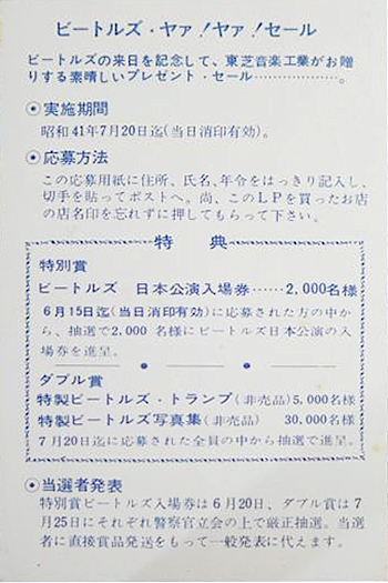 Japan. The commemorative disks of the Beatles' Japan visit: Toshiba EMI needed to make special commemorative disks, but the idea of making an original best album ("the Best of the Beatles" OP-7177), which they once planned to release in 1965, was turned down by E. M. I. in England again and this album remained unreleased. therefore, they had to use existing albums to promote for the 'Yeah Yeah Sale'. At the early stage of the sale, they advertised the then new album "Rubber Soul" (released on 15th March 1966 in Japan), but later they decided to release two albums "Please Please Me" and "With The Beatles", both of which had been unreleased in Japan. They re-named them as "STEREO! This is the Beatles Vol.1" and "Vol.2", changing song orders to put the most popular songs in Japan at the first place of every record. They made original covers, gatefold covers with photo books inside, and they emphasized that these were STEREO records (this might be an impact because stereo equipment had just become popular). The jacket was replaced with a completely different photo. Black Odeon label with silver print. The words "MFD. BY TOSHIBA MUSICAL INDUSTRIES LTD. IN JAPAN" was printed at the perimeter on the label. The words "LONG PLAYING" was NOT printed at the bottom of the label. Gatefold type. Full laminated soft cover with attached 8-page color booklet. Red vinyl: Besides good sound and quality printing, Japanese records also offered some other things of interest to the collector. One of the primary manufacturing companies in Japan, Toshiba, pressed a lot of their records on red, “Everclean” vinyl from 1958 through 1974 (maybe). While not pressed as collectors’ items, these red vinyl pressings are more sought out by collectors than their black vinyl counterparts. The Everclean vinyl was designed to be less prone to collecting static electricity and dust than the more common black vinyl. The obi: Custom Red obi. The commemorative custom red obi of the Beatles' Japan visit. It also features an Odeon logo, catalogue number and price information. While most Japanese records feature local music, a lot of music fans there like foreign music, as well. The language barrier in Japan presented a problem – should foreign album covers be changed for Japanese albums? The solution was the obi, which means “belt” or “sash”. The obi is a strip of paper, usually about two inches wide, that wraps vertically around the album cover, containing information about the artist and album in Japanese. As these strips of paper were fragile and easily torn, they are often missing, especially since consumers in the 1950s and 1960s attached little significance to them. Finding Japanese records made prior to 1970 that still have the obi intact can be quite difficult, and for some albums, nearly impossible. The inclusion of the obi can dramatically affect the price of some Japanese records, sometimes increasing the price by a factor of ten. |