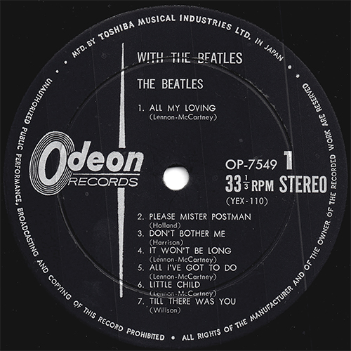 Japan The order of the songs on the UK version "WITH THE BEATLES" has been significantly changed, and songs popular in Japan have been placed at the top of the A and B sides. The jacket was replaced with a completely different photo. Light green Apple label Type-2-1 with black print. The words "MFD. BY TOSHIBA MUSICAL INDUSTRIES LTD. JAPAN" was printed at the bottom of the label. In Novemver 1968, that was the date when Apple Corp Ltd. of England and Toshiba came to an agreement on the manufacturing and distribution of the Beatles' records in Japan. As part of that agreement, Toshiba had to reissue on the Apple label all the records previously issued on the Odeon label. The sleeves also had to be altered to desplay the Apple logo. Futher still, all the Odeon catalog number prefixes were changed to ones with Apple prefixes. In most cases, only the prefixes were changed and the catalog numbers were left intanct. Odeon singles, EPs, and LPs with the OR or OP prefixes were changed to Apple singles, EPs, and LPs with the AR or AP prefixes, respectively. But Toshiba did not instantly implement all these changes and did not immediately withdraw all Odeon label records. In fact, the phasing out of the Odeon label products and the phasing in of the Apple label was a lengthy process taking several months at least. The very first record in Japan issued under the Toshiba/Apple contract and bearing the Apple label was "The Beatles double LP (the White Album)", released on 21th. January 1969. And unlike elsewhere in the world, the first single in Japan to bear the Apple label was not "Hey Jude / Revolution" but rather "Ob- La-Di, Ob-La-Da / While My Guitar Gently Weeps", released on 10th. March, 1969. And in the Apple label, there are two subtypes, TOSHIBA MUSIC and TOSHIBA EMI. Further more, the early copies of the APPLE-TOSHIBA MUSIC type have dark Apple on its label, though the late copies have light one. The song title of the 7th. song on side-2 was printed "YOU REALLY GOTTA HOLD ON ME". Gatefold type. Full laminated soft cover with attached 8-page color booklet. On the booklet, this issue was mistitled the track "You Really Got A Hold On Me" as "You've Really Got. A Hold On Me.". Red vinyl: Besides good sound and quality printing, Japanese records also offered some other things of interest to the collector. One of the primary manufacturing companies in Japan, Toshiba, pressed a lot of their records on red, “Everclean” vinyl from 1958 through 1974 (maybe). While not pressed as collectors’ items, these red vinyl pressings are more sought out by collectors than their black vinyl counterparts. The Everclean vinyl was designed to be less prone to collecting static electricity and dust than the more common black vinyl. The obi: Custom RED / Yellow obi. The commemorative custom orange obi of the Beatles' Japan visit. It also features an Apple logo, catalogue number and price information. Very early Pressings have a custom Orange / yellow obi (maybe). Regular pressings, the obi color returned to RED (maybe). While most Japanese records feature local music, a lot of music fans there like foreign music, as well. The language barrier in Japan presented a problem – should foreign album covers be changed for Japanese albums? The solution was the obi, which means “belt” or “sash”. The obi is a strip of paper, usually about two inches wide, that wraps vertically around the album cover, containing information about the artist and album in Japanese. As these strips of paper were fragile and easily torn, they are often missing, especially since consumers in the 1950s and 1960s attached little significance to them. Finding Japanese records made prior to 1970 that still have the obi intact can be quite difficult, and for some albums, nearly impossible. The inclusion of the obi can dramatically affect the price of some Japanese records, sometimes increasing the price by a factor of ten. |