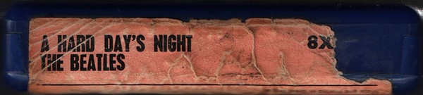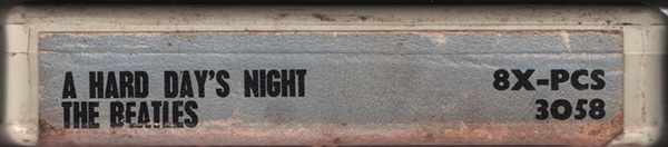 artwork for this album. Original issue with a "tombstone label," plastic tape protector fitted to the top of the cartridge, and released in generic cardboard EMI case (maybe). There are three types of title background colors on the label surface: orange, pink, and light blue (maybe). "IE" catalogue number (*1) in addition to the ordinary "8X-PCS 3058" EMI catalogue number. The magnetic tape is played at 3 3/4 (3.75) inches per second (twice the speed of a cassette). The 8 track cartridge format was jointly developed by Ampex Magnetic Company, RCA Records and Lear Jet Company primarily as a dashboard-based music system for the booming car market. The format was launched in the USA in September 1965, with RCA Victor releasing 175 titles and the Ford Motor Company announcing the format as an option on many of its new 1966 car models. Not long after, players designed for the home began to appear, often incorporated into Reel-to-Reel players. 8 track stereo cartridges comprised four parallel pairs of two-channel stereo programmes: tracks 1 and 5 comprised the first section, 2 and 6 the second, 3 and 7 the third, and 4 and 8 the fourth section. Tracks 1 through 4 were heard through the left speaker while tracks 5 through 8 were heard through the right speaker. All four sections were approximately equal in length and played automatically in sequence. The similar section length often meant that albums had to be re-sequenced to fit the medium, or, in some instances, having songs added, edited or repeated. Conversely, it could also result in long periods of silence between sections. The original Beatles 8 track cartridge release of "Sgt. Peppers" in Oct. or Nov. 1969, through "Abbey Road (Nov. 1969)", "Let It Be (August 1970)", and the first release of most of the other Beatles 8 track albums in Sept. and Oct, 1970, just months after EMI opened their new tape duplicating facilities at Hayes in Middlesex in July, 1970. EMI UK commence manufacture of cartridges in November 1969 (maybe). The cassette and 8-track were released at the same time. (Excluding "Sgt. peppers")