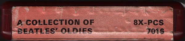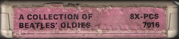 artwork for this album. Original issue with a "tombstone label," plastic tape protector fitted to the top of the cartridge, and released in generic cardboard EMI case (maybe). There are three types of title background colors on the label surface: orange, pink, and light blue (maybe). "IE" catalogue number (*1) in addition to the ordinary "8X-PCS 7016" EMI catalogue number. The magnetic tape is played at 3 3/4 (3.75) inches per second (twice the speed of a cassette). In the case of "She Loves You", the 1963 two-track recording tape had since been reused, forcing EMI engineer Geoff Emerick to return to the mono master and create a "mock stereo" mix. The 8 track cartridge format was jointly developed by Ampex Magnetic Company, RCA Records and Lear Jet Company primarily as a dashboard-based music system for the booming car market. The format was launched in the USA in September 1965, with RCA Victor releasing 175 titles and the Ford Motor Company announcing the format as an option on many of its new 1966 car models. Not long after, players designed for the home began to appear, often incorporated into Reel-to-Reel players. 8 track stereo cartridges comprised four parallel pairs of two-channel stereo programmes: tracks 1 and 5 comprised the first section, 2 and 6 the second, 3 and 7 the third, and 4 and 8 the fourth section. Tracks 1 through 4 were heard through the left speaker while tracks 5 through 8 were heard through the right speaker. All four sections were approximately equal in length and played automatically in sequence. The similar section length often meant that albums had to be re-sequenced to fit the medium, or, in some instances, having songs added, edited or repeated. Conversely, it could also result in long periods of silence between sections. The original Beatles 8 track cartridge release of "Sgt. Peppers" in Oct. or Nov. 1969, through "Abbey Road (Nov. 1969)", "Let It Be (August 1970)", and the first release of most of the other Beatles 8 track albums in Sept. and Oct, 1970, just months after EMI opened their new tape duplicating facilities at Hayes in Middlesex in July, 1970. EMI UK commence manufacture of cartridges in November 1969 (maybe). The cassette and 8-track were released at the same time. (Excluding "Sgt. peppers")