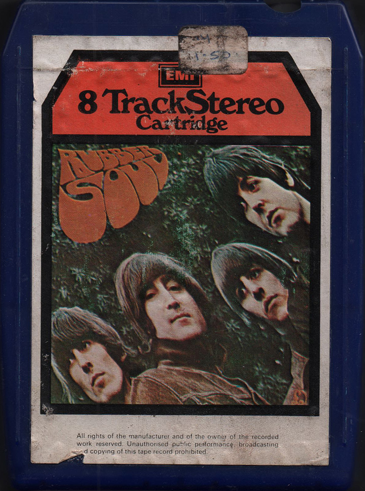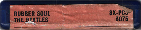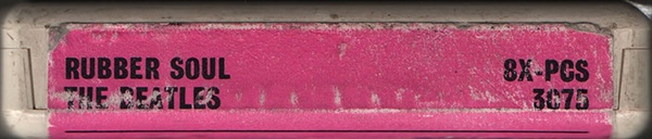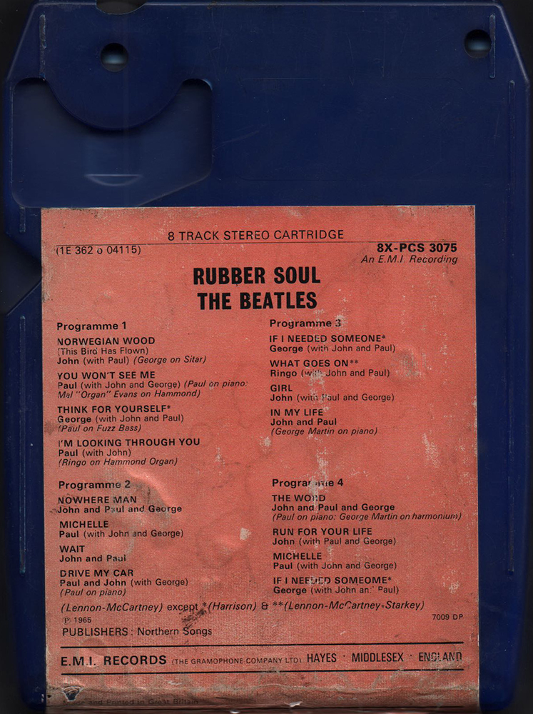 artwork for this album. Original issue with a "tombstone label," plastic tape protector fitted to the top of the cartridge, and released in generic cardboard EMI case (maybe). There are three types of title background colors on the label surface: orange, pink, and light blue (maybe). "IE" catalogue number (*1) in addition to the ordinary "8X-PCS 3075" EMI catalogue number. The magnetic tape is played at 3 3/4 (3.75) inches per second (twice the speed of a cassette). The 8 track cartridge format was jointly developed by Ampex Magnetic Company, RCA Records and Lear Jet Company primarily as a dashboard-based music system for the booming car market. The format was launched in the USA in September 1965, with RCA Victor releasing 175 titles and the Ford Motor Company announcing the format as an option on many of its new 1966 car models. Not long after, players designed for the home began to appear, often incorporated into Reel-to-Reel players. 8 track stereo cartridges comprised four parallel pairs of two-channel stereo programmes: tracks 1 and 5 comprised the first section, 2 and 6 the second, 3 and 7 the third, and 4 and 8 the fourth section. Tracks 1 through 4 were heard through the left speaker while tracks 5 through 8 were heard through the right speaker. All four sections were approximately equal in length and played automatically in sequence. The similar section length often meant that albums had to be re-sequenced to fit the medium, or, in some instances, having songs added, edited or repeated. Conversely, it could also result in long periods of silence between sections. On the 8-track Rubber Soul, "If I Needed Someone" and "Michelle" are recorded repeatedly to adjust the track time (Programme4) The original Beatles 8 track cartridge release of "Sgt. Peppers" in Oct. or Nov. 1969, through "Abbey Road (Nov. 1969)", "Let It Be (August 1970)", and the first release of most of the other Beatles 8 track albums in Sept. and Oct, 1970, just months after EMI opened their new tape duplicating facilities at Hayes in Middlesex in July, 1970. EMI UK commence manufacture of cartridges in November 1969 (maybe). The cassette and 8-track were released at the same time. (Excluding "Sgt. peppers")