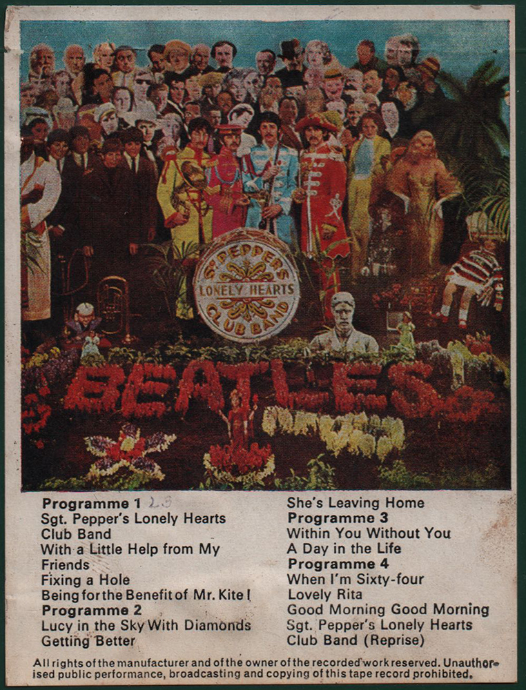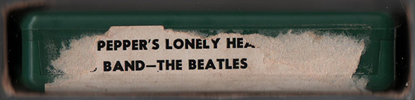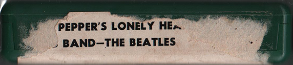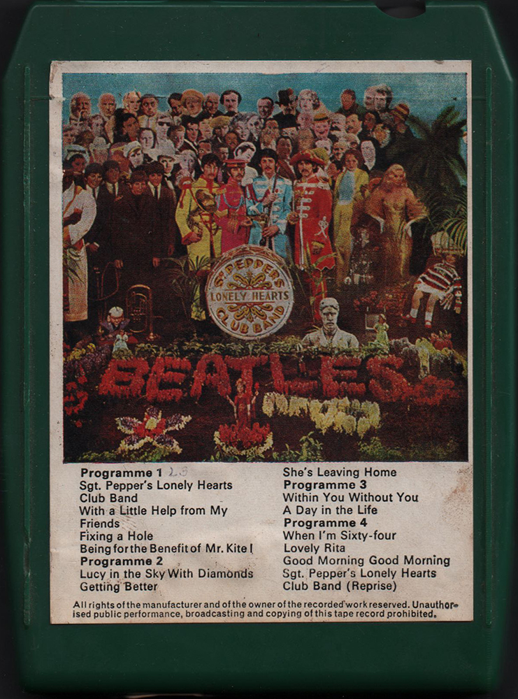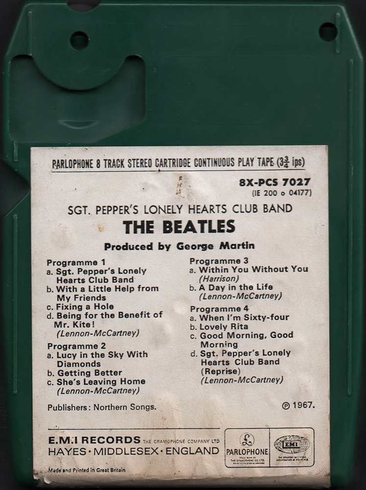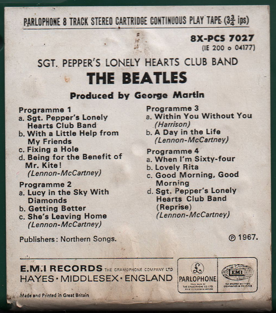 artwork for this album. The 8-track cartridge were issued with a £ Parlophone logo. "IE" catalogue number (*1) in addition to the ordinary "8X-PCS 7027" EMI catalogue number. The magnetic tape is played at 3 3/4 (3.75) inches per second (twice the speed of a cassette). Plastic tape protector fitted to the top of the cartridge, and released in generic cardboard EMI case (maybe). The original versions of this 8-track DID NOT include a version of the "Sgt.Pepper Inner Groove". The 8 track cartridge format was jointly developed by Ampex Magnetic Company, RCA Records and Lear Jet Company primarily as a dashboard-based music system for the booming car market. The format was launched in the USA in September 1965, with RCA Victor releasing 175 titles and the Ford Motor Company announcing the format as an option on many of its new 1966 car models. Not long after, players designed for the home began to appear, often incorporated into Reel-to-Reel players. 8 track stereo cartridges comprised four parallel pairs of two-channel stereo programmes: tracks 1 and 5 comprised the first section, 2 and 6 the second, 3 and 7 the third, and 4 and 8 the fourth section. Tracks 1 through 4 were heard through the left speaker while tracks 5 through 8 were heard through the right speaker. All four sections were approximately equal in length and played automatically in sequence. The similar section length often meant that albums had to be re-sequenced to fit the medium, or, in some instances, having songs added, edited or repeated. Conversely, it could also result in long periods of silence between sections. The original Beatles 8 track cartridge release of "Sgt. Peppers" in Oct. or Nov. 1969, through "Abbey Road (Nov. 1969)", "Let It Be (August 1970)", and the first release of most of the other Beatles 8 track albums in Sept. and Oct, 1970, just months after EMI opened their new tape duplicating facilities at Hayes in Middlesex in July, 1970. EMI UK commence manufacture of cartridges in November 1969 (maybe). The cassette and 8-track were released at the same time. (Excluding "Sgt. peppers")