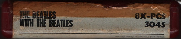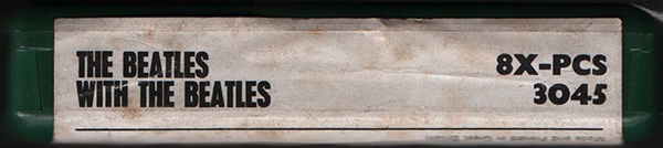 artwork for this album. Original issue with a "tombstone label," plastic tape protector fitted to the top of the cartridge, and released in generic cardboard EMI case (maybe). There are three types of title background colors on the label surface: orange, pink, and light blue (maybe). "IE" catalogue number (*1) in addition to the ordinary "8X-PCS 3045" EMI catalogue number. The magnetic tape is played at 3 3/4 (3.75) inches per second (twice the speed of a cassette). The 8 track cartridge format was jointly developed by Ampex Magnetic Company, RCA Records and Lear Jet Company primarily as a dashboard-based music system for the booming car market. The format was launched in the USA in September 1965, with RCA Victor releasing 175 titles and the Ford Motor Company announcing the format as an option on many of its new 1966 car models. Not long after, players designed for the home began to appear, often incorporated into Reel-to-Reel players. 8 track stereo cartridges comprised four parallel pairs of two-channel stereo programmes: tracks 1 and 5 comprised the first section, 2 and 6 the second, 3 and 7 the third, and 4 and 8 the fourth section. Tracks 1 through 4 were heard through the left speaker while tracks 5 through 8 were heard through the right speaker. All four sections were approximately equal in length and played automatically in sequence. The similar section length often meant that albums had to be re-sequenced to fit the medium, or, in some instances, having songs added, edited or repeated. Conversely, it could also result in long periods of silence between sections. The original Beatles 8 track cartridge release of "Sgt. Peppers" in Oct. or Nov. 1969, through "Abbey Road (Nov. 1969)", "Let It Be (August 1970)", and the first release of most of the other Beatles 8 track albums in Sept. and Oct, 1970, just months after EMI opened their new tape duplicating facilities at Hayes in Middlesex in July, 1970. EMI UK commence manufacture of cartridges in November 1969 (maybe). The cassette and 8-track were released at the same time. (Excluding "Sgt. peppers")