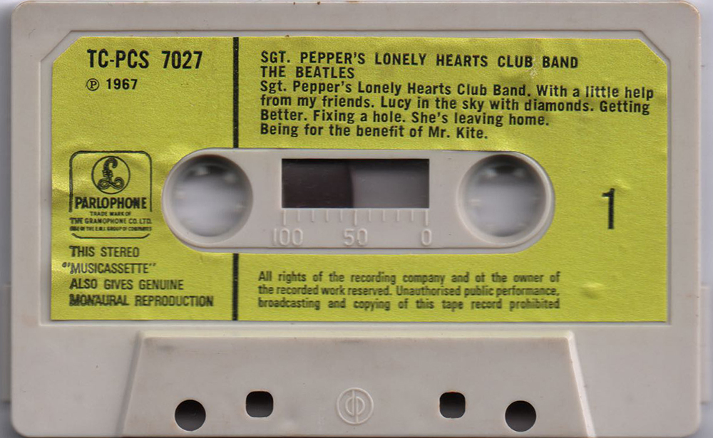 Hearts Club Band. There were many reissues of The Beatles albums during the lifetime of the cassette's popularity 1970 through to the 1990s. This item was the original first release, before EMI opened its new tape duplicating facilities at Hayes, Middlesex in July 1970. Between 1966 and June 1970, EMI's early musicassettes were manufactured by the Dutch firm, Phillips themselves - the inventor and originator of the cassette. There is no date code on the inlay which dates this cassette manufacture as before July 1970, when EMI brought in the system. Has the lime green paper label, with the track listing the same as on the vinyl album. At the time of the vinyl release in June 1967 the new "musicassette" format had only been introduced in the UK a few months earlier and very few titles were available. EMI had no cassette production of its own so Philips were sub-contracted to manufacture a first cassette tape issue of SGT. PEPPER that have been released into the market October '67. These true first issue copies are identifiable by their Mint Green paper labels, screwed cassette shells and the "SOLD IN THE U.K. SUBJECT TO RESALE PRICE CONDITIONS..." text to the labels. The original Pepper cassettes were issued with a £ Parlophone logo. It has a light grey tape shell with five screws. The metal screws was holded the two halves of the shell together. It has mint green paper labels with boxed Parlophone "£" logo to the left hand side and "SOLD IN U.K. SUBJECT TO RESALE PRICE CONDITIONS, SEE PRICE LISTS" to the bottom right corner. NO "IE" catalogue number (*1) in addition to the ordinary "TC-PCS 7027" EMI catalogue number. The side one leader tape has a printed catalogue number PCS 7027 and serial/batch number L7-13. When this first small batch sold out a second issue of the cassettes was ordered from Philips, believed to have been in 1969. These are almost identical but they have welded tape shells (had no screws) and the labels do not have the "SOLD IN THE U.K." text. From late 1970, EMI began producing cassette tapes at their Hayes factory, and a third edition of the album was produced using the original pattern and a distinctive lemon yellow paper label with a completely different layout, initially bearing the Parlophone logo, and eventually the new-style black box Pharlophone/EMI logo introduced in September/October 1970 to coincide with the initial release dates of key Beatles albums elsewhere. Light Grey Shell with 3 windows (Phillips made?), embossed "dp" logo mark. The cassette cases ("Norelco" cases) were clear plastic at the front and around the spine area, and black plastic at the rear. It has the first variant matt card inlay with a red banner and yellow spine. The original inlay design (with the "Sold in the UK..." text), was continued to be used, up to the introduction of the newly designed all-gold inlay in January 1972. The circular 1 7/8" I.P.S. (inches per second tape speed) and a colour reproduction of the back cover of the vinyl jacket on the foldover. The track listings were printed on the reverse of the inlay. Unlike the 1970's inlays, the original design for the album did include some extra artwork rather than just a reproduction of the front cover. The Pepper inlay foldover included black & white cut outs of the Beatles heads (as originally posed for the vinyl gatefold). As with all Beatles cassettes issued until 1987, the cassette boxes (or to use the correct term, the Norelco cases) were transparent at the front and around the spine area (to reveal the inlay cover) and black at the rear. The shells of the early cassettes were white/light grey. The original and gold versions of this cassette include a version of the "Sgt.Pepper Inner Groove" that was NOT artificially repeated and then faded - on these cassettes you hear it ONCE only. (*1) EMI country code: The EMI country codes (introduced on 1 June, 1969): In most cases the EMI Codes are the first two letters of the record's catalog#. These EMI Country Codes were used to indicate the country in which the record was pressed. Note this doesn't necessarily means the record was also released in that country (from Discog). OC / 0C / 1E= UK (*2)Data Packaging Corporation: (who also traded as Hellerman Data Packaging Ltd) supplied cassette and 8 track shells, tape and other components to the music industry. The "DP" logo can often be found moulded into cassette shells, especially during the early to mid 1970s. |