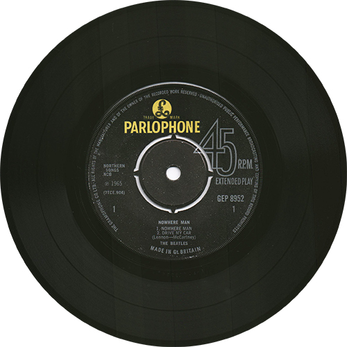 text has gone from the label. Beginning in 1964, Parlophone (and all the other EMI companies) began printing a phrase in the centers of all their singles, EP's and LP's, which said: SOLD IN U.K. SUBJECT TO RESALE PRICE CONDITIONS, SEE PRICE LISTS. This notice appears on the labels of every UK market EMI product, from very early 1964, right through mid-1969. On 1st July 1965, EMI underwent a merger and each individual ceased to be a L.T.D. company and became a subsidiary of "The Gramophone Co. Ltd." which was owned by EMI. This merger meant yet another label change occurred and previous "Parlophone Co. Ltd." rims where replaced with the new "Gramophone" rims. On the label, The publisher's name was printed in "Sans-serif" wide type. EP's title and group name were printed in "Sans-serif" narrow type. Song titles were printed "Sans-serif" wide type. 3rd. pressings were manufactured two ways: both with and without the push-out center. With polo ring on side-2. |
