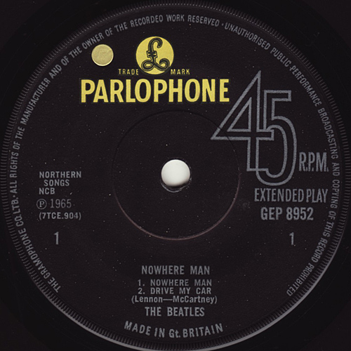text has gone from the label. Beginning in 1964, Parlophone (and all the other EMI companies) began printing a phrase in the centers of all their singles, EP's and LP's, which said: SOLD IN U.K. SUBJECT TO RESALE PRICE CONDITIONS, SEE PRICE LISTS. This notice appears on the labels of every UK market EMI product, from very early 1964, right through mid-1969. On 1st July 1965, EMI underwent a merger and each individual ceased to be a L.T.D. company and became a subsidiary of "The Gramophone Co. Ltd." which was owned by EMI. This merger meant yet another label change occurred and previous "Parlophone Co. Ltd." rims where replaced with the new "Gramophone" rims. On the label, The publisher's name was printed in "Sans-serif" narrow type. EP's title and group name were printed in "Sans-serif" narrow type. Song titles were printed "Sans-serif" narrow type. 3rd. pressings were manufactured two ways: both with and without the push-out center. |