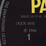 Parlophone label with silver print: the name "THE GRAMOPHONE CO. LTD.(capital letter)" on the outer rim, the "SOLD IN U.K." remark, and the "(P) 1966" statement. Sleeves for "Revolver (mono)" did two London’s of printing house: Ernest J. Day & Co Ltd. and Garrod & Lofthouse Ltd. This issue has a sleeve made by Ernest J. Day. The mono and stereo releases were issued in separate catalog number series until early 1966. In 1966, the catalog number series was restarted at 7001 with mono and stereo releases now having the same catalog numbers. First pressing with mispressing. Side 2 matrix no.: XEX 606-1 have "Remix 11" of "Tomorrow Never Knows". When "Revolver" was initially mixed a different master for "Tomorrow Never Knows" was sent off to be pressed. This mix is known as "Remix 11". Although subtle, it is different to the standard "Remix 8" which was ultimately to replace it. The story goes that each group member was given the first copies from the production line and John went to listen to it. But, it turned out that he was unhappy with the mix or that the wrong one had been used and he informed George Martin. Production was then stopped as the new masters were cut and the pressing plates were replaced. First presses have a side 2 matrix number of XEX 606-1 whereas the standard presses have XEX 606-2 and beyond. (According to "TheBeatles-Collection.com") First label has Sans-serif print and song name “DR. ROBERT” on the Side 2. |