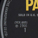 perimeter print and MADE IN GT. BRITAIN lower text. Matrix numbers: Side 1: YEX 605-1; Side 2: YEX 606-1. |