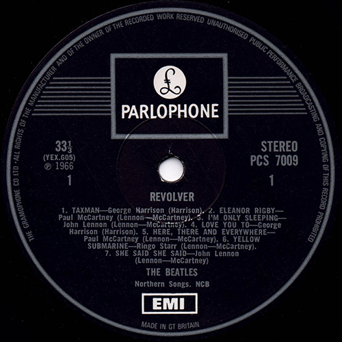 as the Silver and Black design. Sleeves for "Revolver (stereo)" did two London’s of printing house: Ernest J. Day & Co Ltd. and Garrod & Lofthouse Ltd. This issue has a sleeve made by Garrod & Lofthouse. The word "stereo" was erased on the upper right front corner of the front cover. "THE GRAMOPHONE CO. LTD. (capital letter)" was printed at the perimeter. "(P) 1966" statement was printed on the label. It should be added, that the labels for this edition have a misprint. On the Side 2, Instead of "Got To Get You Into My Life" was printed " I Got To Get You Into My Life". |