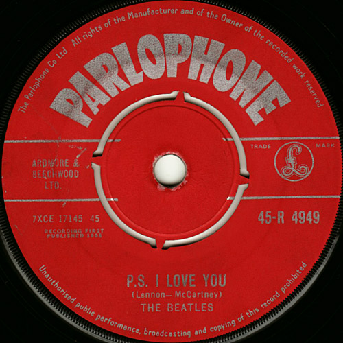 Red Parlophone Label. Matrix suffixed with "1N" indicating "Ringo on drums and no tambourine" version. The Beatles first single was released on October 5, 1962. The Beatles first entered EMI Studios on Abbey Road on June 6, 1962, when the bandfs lineup was John Lennon on rhythm guitar, Paul McCartney on bass, George Harrison on lead guitar and Pete Best on drums. Four songs were recorded that day: gBesame Muchoh, gLove Me Doh, gP.S. I Love Youh and gAsk Me Whyh. In August, 1962, Pete Best was fired and replaced by Ringo Starr. On September 4, 1962, the Beatles returned to Abbey Road to record their first single. The Beatles recorded a number of takes of gLove Me Doh and, much against their wishes, gHow Do You Do Ith. Ringo played drums. On September 11, 1962, the Beatles recorded gLove Me Doh, gP.S. I Love Youh and gPlease Please Meh, which features Paul on lead vocal and bass, supported by John and George on backing vocals and guitars. Andy White, the drummer of the studio, plays the drums. Ringo played tambourine and maracas. But on the first pressings used the version of gLove Me Doh with Ringofs drumming recorded on September 4. There are two kinds of subtype in the red label; one does not have the name of the country at the right part of the label (under the trade mark) and another is with the words "MADE IN GT. BRITAIN". Please note that the record number is still "45-R 4949". The prefix "45" seems apparently for "45 RPM (Revolutions Per Minute)", later the number became simply "R 4949". On side-2; #1-4: Missing Bracket: (Lennon -McCartney #1-5: corrected credits: (Lennon -McCartney)