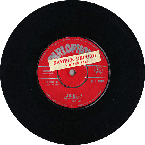 Red Parlophone Label. After the test pressings were approved, and copies were run with the promo labels on them, the printer then loaded the machines with the proper labels for the disk's standard release. Then samples were taken from possibly each press machine making the records, and affixed with a sticker (red ink on white) and checked for quality. Except for the sticker, the disk is exactly as it will be when it is released. Matrix suffixed with "1N" indicating "Ringo on drums and no tambourine" version. The Beatles first single was released on October 5, 1962. The Beatles first entered EMI Studios on Abbey Road on June 6, 1962, when the bandfs lineup was John Lennon on rhythm guitar, Paul McCartney on bass, George Harrison on lead guitar and Pete Best on drums. Four songs were recorded that day: gBesame Muchoh, gLove Me Doh, gP.S. I Love Youh and gAsk Me Whyh. In August, 1962, Pete Best was fired and replaced by Ringo Starr. On September 4, 1962, the Beatles returned to Abbey Road to record their first single. The Beatles recorded a number of takes of gLove Me Doh and, much against their wishes, gHow Do You Do Ith. Ringo played drums. On September 11, 1962, the Beatles recorded gLove Me Doh, gP.S. I Love Youh and gPlease Please Meh, which features Paul on lead vocal and bass, supported by John and George on backing vocals and guitars. Andy White, the drummer of the studio, plays the drums. Ringo played tambourine and maracas. But on the first pressings used the version of gLove Me Doh with Ringofs drumming recorded on September 4. |