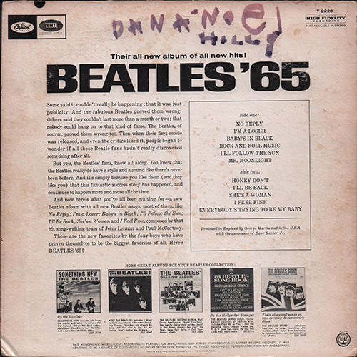 backdrops with an outer rim colorband. First "West Coast" Pressings have "BEATLES' 65" tightly spaced. |