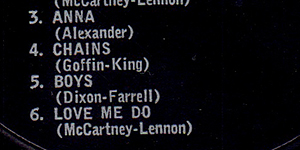 American public. "Introducing The Beatles" opens with the hard rocking Lennon-McCartney original "I Saw Her Standing There". The Parlophone discs include Paulfs full gOne, two, three, faaa!h lead count-in, whereas both the mono and stereo versions of the Vee-Jay album pick up the count at four. The title of the album appears at the top of the jacket on two lines as "introducing... THE BEATLES" with the first word in white and the groupfs name in red. This is followed by the phrase "ENGLANDS No.1 VOCAL GROUP" in white to let the American public know of the groupfs popularity in their homeland. The mono covers have the slick positioned so that the number LP 1062 appears in the lower right hand corner. The positioning of the slick on the stereo covers cuts off all of Paulfs arms except for a sliver of his thumbs and exposes a white top banner with "STEREOPHONIC" centered in grey and the number SR 1062 in black in the upper right-hand corner. They used the photo from the The Beatles' Hits EP, chopped off their feet and reversed the negative—meaning their hair was flowing the wrong way. In 1959, Vee-Jay began using Coburn & Company, an offset printing firm in Chicago, to print the front cover slicks and back cover liner notes for its albums. Coburn included the phrase "Printed in U.S.A." either in upper and lower case or in all capital letters on front cover slicks prepared for Vee-Jay. When Vee-Jayfs financial difficulties in the summer of 1963 prevented the company from paying its suppliers, Coburn refused to accept new orders from Vee-Jay in September and sued Vee-Jay for over $50,000 owed on account. This forced Vee-Jay to switch printers. The new printers did not include the phrase "Printed in U.S.A." on their covers. Coburn prepared 6,000 cover slicks for LP 1062. The 6,000 slicks printed by Coburn for Introducing The Beatles were the first slicks used for the album. These slicks are easily identifiable as they have "Printed in U.S.A." running vertically along the left side of the jacket one to two inches from the lower left corner. Additional cover slicks for Introducing The Beatles were not prepared until nearly six months later. By that time, Vee-Jay was no longer using Coburn to print its album covers. This explains why most copies of the album, as well as the other Beatles albums on Vee-Jay, do not have "Printed in U.S.A." on their covers. The later cover slicks for Introducing The Beatles were probably printed by Ivy Hill Lithograph Corp. at its Los Angeles and Great Neck, New York, locations. There are three different variations to the mono and stereo back covers of Version One of Introducing The Beatles. Type-1) The initial LP jackets have back covers that serve as an advertisement for "OTHER FINE ALBUMS OF SIGNIFICANT INTEREST" on Vee-Jay. The back cover slick has miniature color photographs of the covers of 25 Vee-Jay albums. The front cover has the phrase "Printed in U.S.A." running vertically along its lower left side. This variation is known as the "Ad Back" cover. Type-2)The second variation of the albumfs back cover: The second variation is a glossy blank white slick. This variation is known among collectors as the "Blank Back" cover. Blank Back covers (mono and stereo) have two noticeable but minor variations: with "Printed in U.S.A." on its front cover slick. / later front cover slick without "Printed in U.S.A." Type-3)The third back cover variation is much more conventional. Although this cover has no liner notes or pictures, it does list the song titles in thick black print in two columns. The VJ brackets logo is centered at the top of the cover above the title of the album. All Beatles records on Vee-Jay, there are multiple label variations for this historic album. This is because the records were manufactured at different regional pressing plants. Exhibits filed in Vee-Jayfs New York litigation with Capitol indicate that stampers were initially sent to the same three factories that produced the Beatles 1963 singles: ARP, Monarch and Southern Plastics. These factories initially pressed the album with their existing supply of label backdrops with the Vee-Jay oval logo. In order to keep up with the anticipated huge demand for Introducing The Beatles, Vee-Jay arranged for another factory, Allentown Record Co., Inc. (gARCh) in Allentown, Pennsylvania, to press copies of the album. During the early 1960s, Vee-Jay albums were pressed with black label backdrops with an outer rim colorband featuring an oval logo. In January 1964, Ivy Hill Lithograph Corp. in Great Neck, New York, prepared 107,000 album label backdrops featuring the new brackets logo, which were shipped to ARP, Monarch, Southern Plastics and ARC. As the first three companies served as regional factories for Vee-Jay throughout 1963 and had thousands of oval logo label backdrops on hand, their pressings of Version One of Introducing The Beatles were made exclusively with leftover oval logo label backdrops. This was not the case with ARC, which Vee-Jay brought on line in January of 1964 to meet the huge demand for Introducing The Beatles. Since ARC never had any Vee-Jay oval logo label backdrops, all albums pressed by ARC feature the brackets logo. The most common mono record label variation for Version One of Introducing The Beatles: It has a black label featuring an outer rim colorband and the oval logo. There are three typesetting variations. Type-1) Has centered song titles and song- writersf credits with "INTRODUCING THE BEATLES" in medium print and "Long Playing" and "Microgroove" on the label. The trail off areas have the hand-etched matrix number 63-3402 on Side I and 63-3403 on Side II. Both sides have the hand- etched initials "RA" and "A" as well as the machine stamped Audio Matrix and "ARP" logos. The initials gRAh indicate that the metal parts used to press these records were generated from lacquers cut at Universal in Chicago by Roger Anfinsen. This variation was pressed by ARP. Type-2-1) has lef